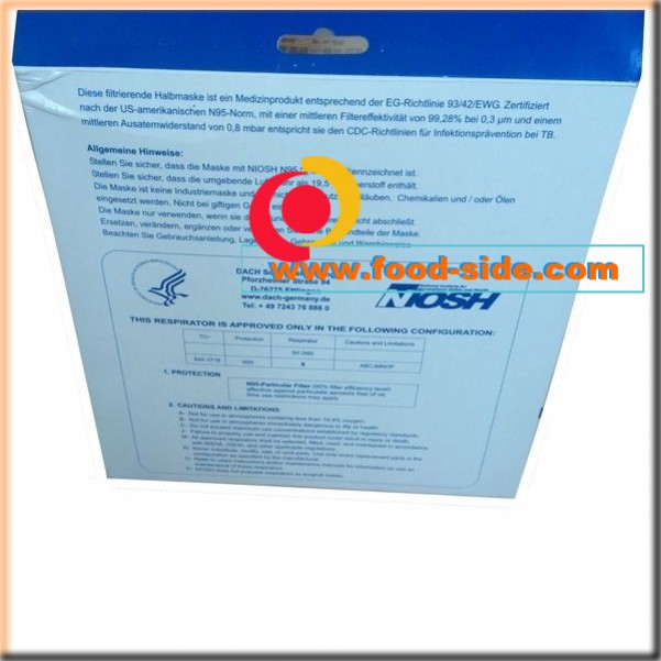 Респираторная маска N95 DACH состоит из трех слоев защиты: внешний - защищает от брызг биологических жидкостей, средний - фильтр, а внутренний - предохраняет от сырости. Не содержит стекловолокна, не содержит аллергенные элементы в своем составе и имеет хорошую воздухопроницаемость. Высокая фильтрационная способность. Одноразовая маска-респиратор N95 DACH изолирует дыхательные органы от 95% вредных частиц диаметром до трех десятых микрона, а значит, эффективно защищают и от частиц диаметром от 2,5 микрон и менее. Защита органов дыхания от дымки, порожденной высокой влажностью, пылью и промышленно-печным дымом. Плотно прилегают к лицу. Одноразовая маска-респиратор N95 С регулируемой носовой частью и защищает органы дыхания человека. Одноразовая маска-респиратор N95 разработана для защиты пользователя от вдыхания опасной пыли, испарений, газа и пара.
